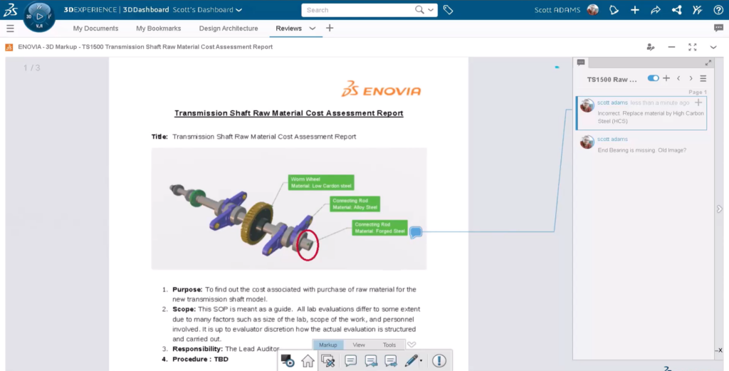 A App 3D Markup, permite verificar conteúdos usando um conjunto de comandos dedicados de anotações e revisões. A partir da versão R2023x FD01, podemos também revisar documentos do MS Office neste aplicativo. A rectificação de documentos do MS Office directamente na plataforma 3DEXPERIENCE® fornece a rastreabilidade completa e melhora a sua produtividade geral.