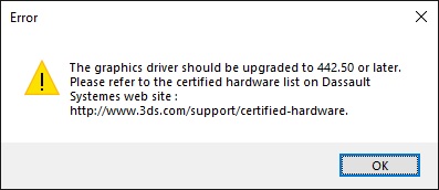 Quando surgir um erro no qual o driver gráfico em utilização não está disponível na lista certificada da Dassault. A seguinte mensagem é exibida na caixa de diálogo: