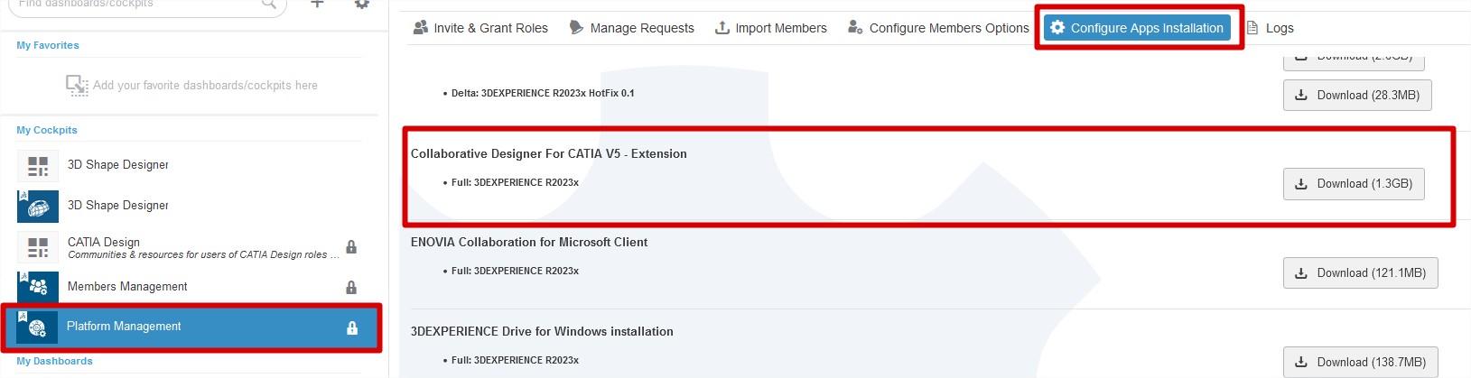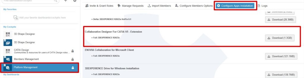 Para usares as versões mais antigas, necessitas que o administrador da plataforma instale o “Collaborative Designer For CATIA V5 – Extension” que se encontra no “Platform Management” – > “Members Control Center” – > “Configure Apps Installation“. Com esta extensão consegues uma integração das versões antigas de CATIA V5 na plataforma, desde V5R18 até à atual.