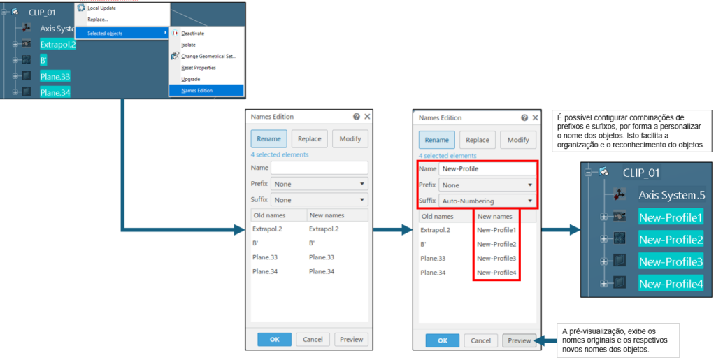 O novo comando “Names Edition”, foi adicionado ao menu de atalho. Podemos utilizar esta ferramenta para personalizar o nome de um ou mais objetos em simultâneo.