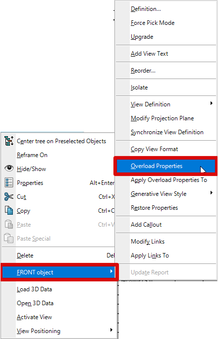 1 – Selecionar a vista -> Botão lado direito -> FRONT object -> Overload Properties