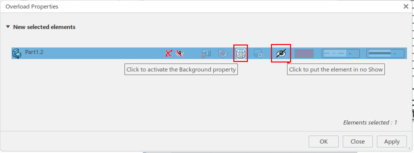 3 – Ativar a opção “Click to put the element in no Show” e o “Click to activate the Background property” (caso queiras visualizar as outras peças que estão por trás da peça que vais esconder) -> Apply -> OK
