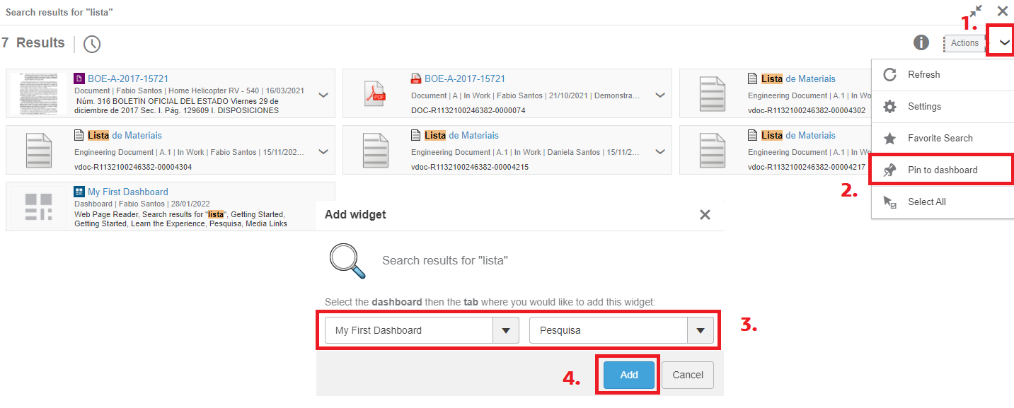 Quando o utilizador faz a mesma pesquisa vezes sem conta no 3DEXPERIENCE®, existe a possibilidade de marcar essa pesquisa num dashboard. Como é que pode ser feito isso? Basta só seguirem os seguintes passos:
