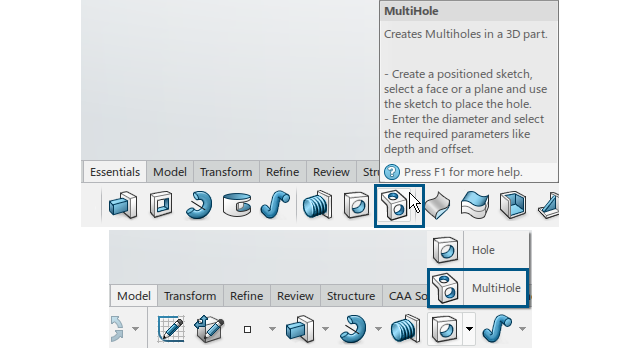 O comando MultiHole foi adicionado à secção Essentials e Model na Action bar.