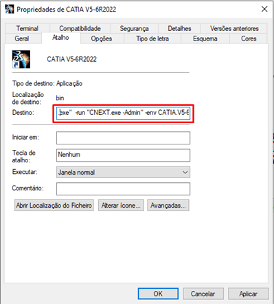 2. De seguida, ir às propriedades do atalho do CATIA V5 e acrescentar ao caminho ‘-Admin’. Como o exemplo seguinte:
