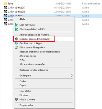 3. Por fim, basta correr o CATIA como administrador (Run as administrator) e no canto superior direito vamos poder observar que o CATIA está a ser corrido em modo administrador.