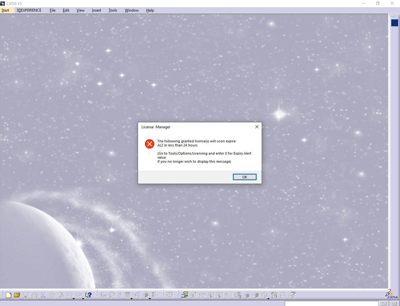 5. Ao abrir o CATIA V5, verificar se aparece uma mensagem a dizer que a licença extraída expira dentro do prazo definido no ponto anterior. Se aparecer, a licença foi extraída com sucesso para o computador e poderás usá-la sem necessitar de aceder ao servidor de licenças.