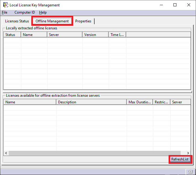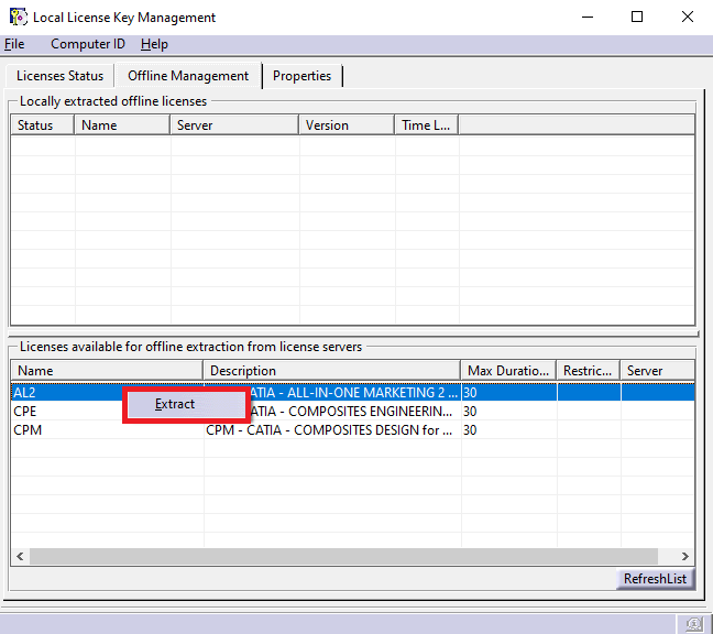 2. Aceder ao separador “Offline Management” e selecionar a opção “RefreshList” para verificar a lista de licenças disponíveis para extrair