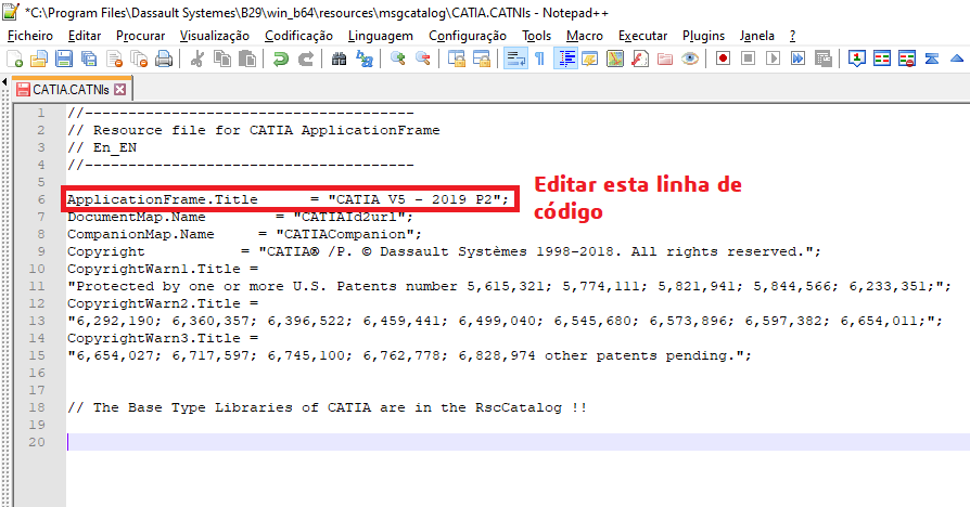 2. Alterar o ficheiro com um editor de texto (Notepad++ por exemplo) em modo administrador e mudar a linha ApplicationFrame.Title = “CATIA “ para ApplicationFrame.Title = “CATIA [NOME PRETENDIDO]”