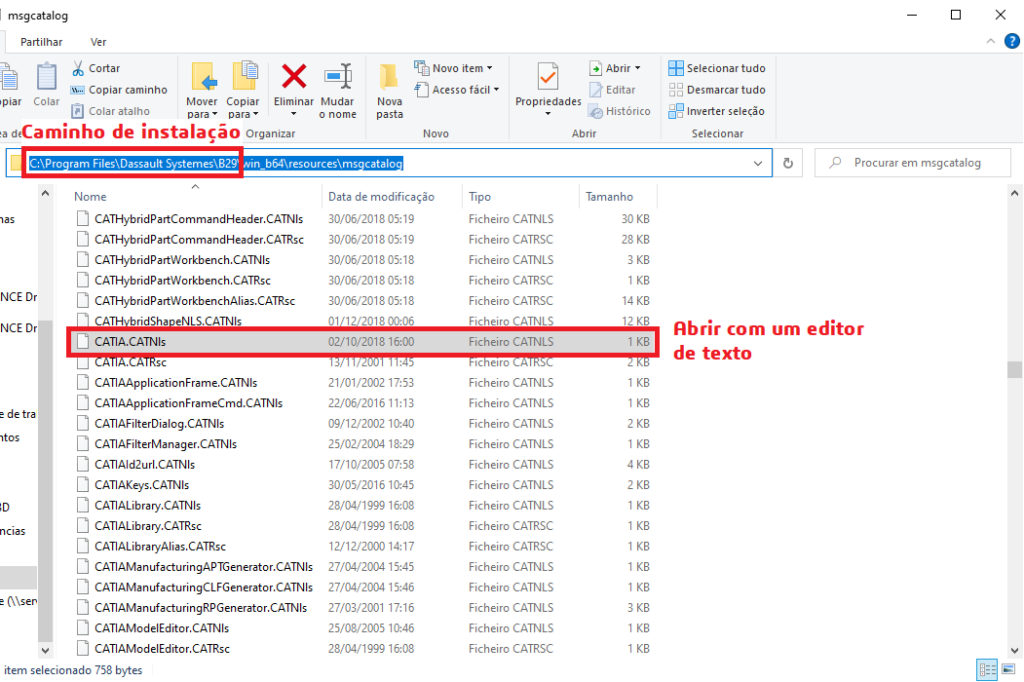 1. Procurar pelo ficheiro CATIA.CATNLS (que está localizado na pasta msgcatalog… [CAMINHO DE INSTALAÇÃO]\win_b64\resources\msgcatalog)